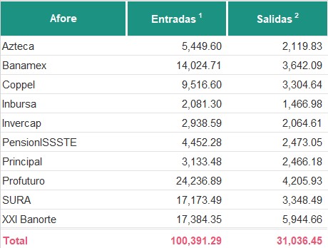 | 2 Incluye transferencias a aseguradoras, transferencias al Gobierno Federal, disposiciones de recursos de los trabajadores por retiros totales, parciales y de ahorro voluntario, traspasos, entre otros. |